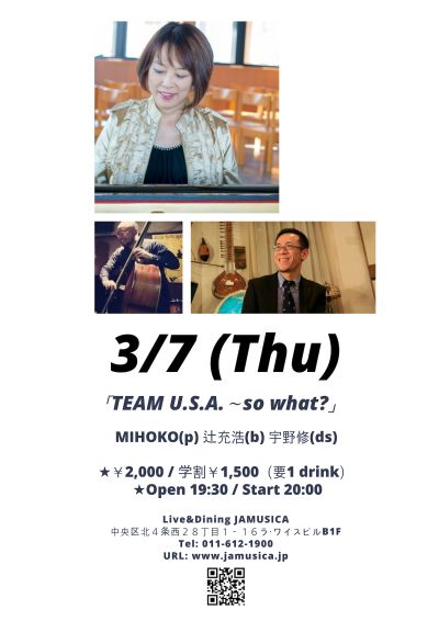 - MIHOKO(p) 蛇池雅人(sax) 阿部ヒロカズ(tp) 菅原昇司(tb) 豊田健(ba) 瀧村正樹(perc) special support:土田佑生(perc)