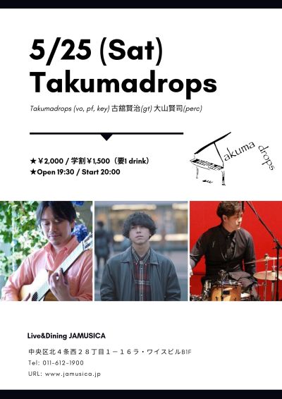 - Takumadrops (vo, pf, key) 中野広也(gt) 吉田昌史(b) エリック吉岡(ds)